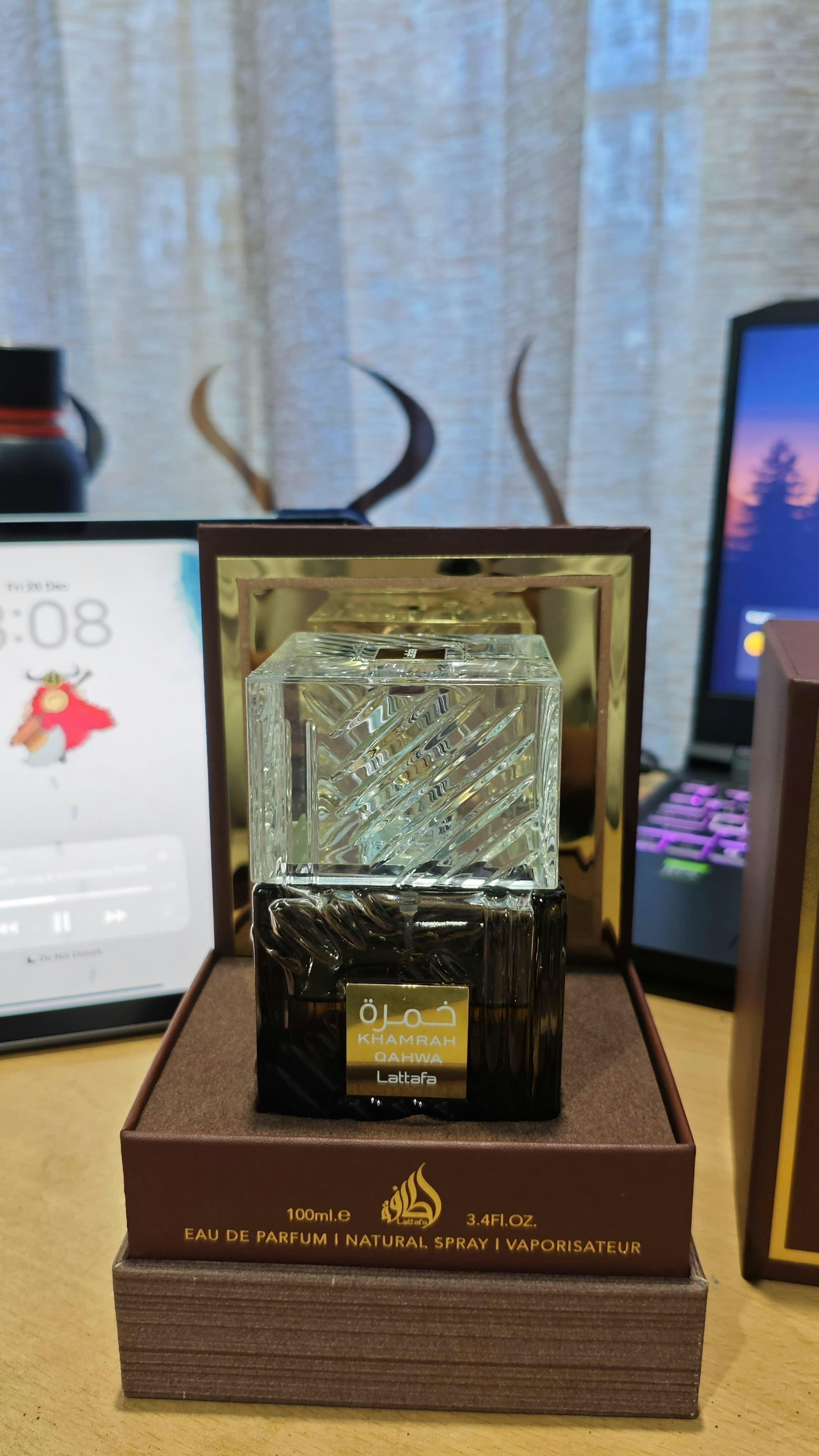 Lattafa Khamrah Qahwa Eau de Parfum is a sweet, spicy and creamy scent made for both men and women. This perfume brings together the cozy warmth of cinnamon and cardamom with the smooth sweetness of praline and vanilla. The mix of coffee and tonka bean gives it a deep, rich aroma that feels comforting yet classy. It’s a perfect scent for people who love strong, dessert like perfumes with a warm base that stays beautifully on the skin.